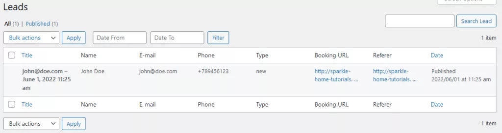 After a user submits the data through the booking widget, all his data are saved in the WP Admin Dashboard.